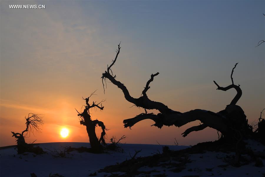Photo taken on Dec. 23, 2014 shows the forest of populus euphratica, commonly known as desert poplar, in Luntai County, Mongolian Autonomous Prefecture of Bayingolin, northwest China's Xinjiang Uygur Autonomous Region. (Photo: Xinhua/Wang Hanbing)