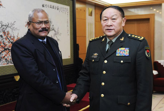 Chinese Defense Minister Liang Guanglie (R) shakes hands with Nepali Deputy Prime Minister Bijay Kumar Gachchadar in Beijing, capital of China, Dec. 26, 2011. (Xinhua/Xie Huanchi)