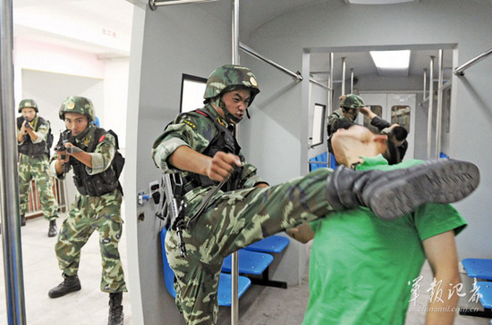 The picture features a scene of the armed policemen in the drill. (China Military Online/Zhang Lin and Jiang Chuanjing)