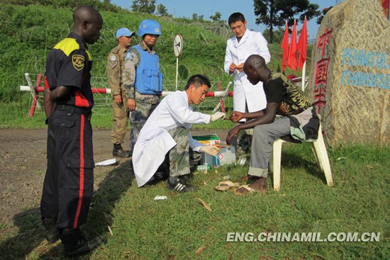 At about 08:00 of January 2, 2012, local time, the 13th Chinese Peacekeeping engineer detachment to Congo (K) provided urgent medical service to a local wounded people, and his wound condition is under control. The detachment was spoken highly by the local people and officials of the MONUSCO.