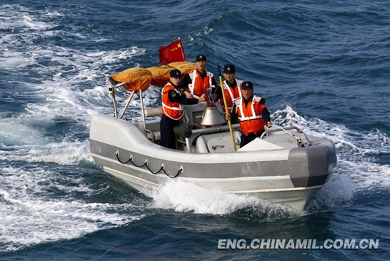 In early February of 2012, the destroyer "Guangzhou" of the South China Sea Fleet of the Chinese People's Liberation Army started its first maritime drilling in the year of 2012 in a water of the South China Sea. The pictures show that the sailors on the destroyer are carrying out training on tying up hauling-off buoy.
