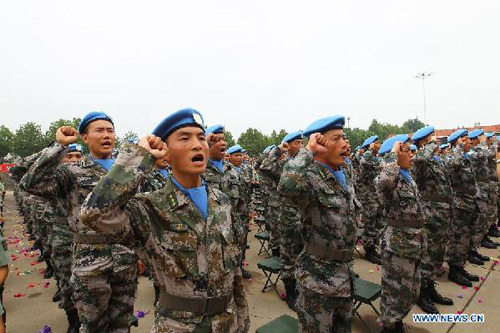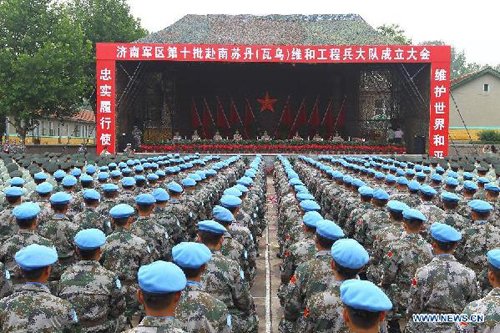 Soldiers of the 10th Chinese peacekeeping engineering detachment to South Sudan take an oath during an inaugural meeting in Yantai, east China's Shandong Province, July 23, 2012. Total of 275 soldiers of the detachment will be deployed in three batches to South Sudan's Wau in September for construction and maintain of roads, bridges, barracks and airports.