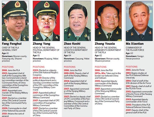 Four generals — Fang Fenghui, Zhang Yang, Zhao Keshi and Zhang Youxia — were named to lead four key PLA departments: general staff, general political, general logistics and general armaments.