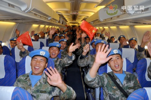 The 100 Chinese peacekeepers who are the third batch of the first Chinese peacekeeping contingent to South Sudan returning to China arrive at the Xinzheng International Airport in central China's Henan province by air on November 24, 2012. (chinamil.com.cn/Shen Dongdong)