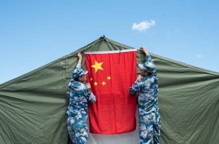 The members of the diving detachment of the PLAN participating in the RIMPAC exercise are hanging a national flag of the PRC outside their camp at the multinational divers' campsite located at the Hickam Air Force Base in Hawaii of the US on July 1, 2014. (Xinhua/Tan Haishi)