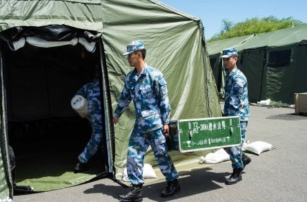 The members of the diving detachment of the PLAN participating in the RIMPAC exercise are carrying the diving equipment into a camp at the multinational divers' campsite located at the Hickam Air Force Base in Hawaii of the US on July 1, 2014. (Xinhua/Tan Haishi)