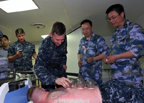 The "Peace Ark" hospital ship of the Navy of the Chinese People's Liberation Army (PLAN) participating in the "Rim of the Pacific 2014" (RIMPAC) multinational naval exercises hosted a training course on traditional Chinese medicine (TCM) on the afternoon of July 8, 2014, local time. A total of 18 medical personnel participating in the RIMPAC 2014 exercise from the navies of the countries including the US, Canada, Singapore and so forth attended the course and experienced the unique effects of the TCM skills such as massage and cupping therapies.