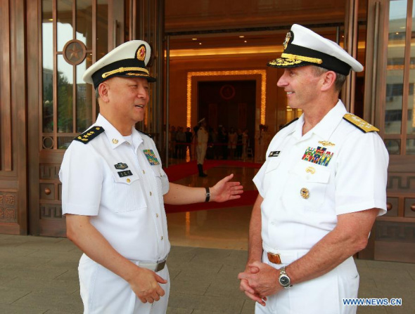 China's navy commander Wu Shengli (L) meets with his U.S. counterpart Jonathan Greenert in Beijing, capital of China, July 15, 2014. (Xinhua/Zha Chunming)