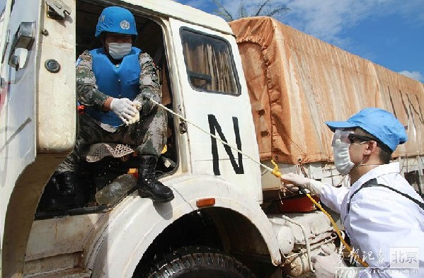 The Chinese peacekeepers are disinfecting the vehicles and personnel after their missions completed. The Chinese peacekeeping force to Liberia is still stationed in the Ebola-stricken area and continuously performs its transport support missions. (Chinamil.com.cn/Zhang Zhen)