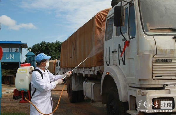 The Chinese peacekeepers are disinfecting the vehicles and personnel after their missions completed. The Chinese peacekeeping force to Liberia is still stationed in the Ebola-stricken area and continuously performs its transport support missions. (Chinamil.com.cn/Zhang Zhen)