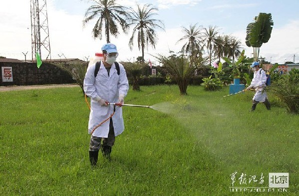 The Chinese peacekeepers carry out the outdoor disinfection and mosquito elimination three times a day. The Chinese peacekeeping force to Liberia is still stationed in the Ebola-stricken area and continuously performs its transport support missions. (Chinamil.com.cn/Zhang Zhen)