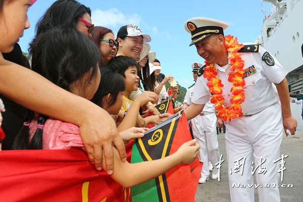 Shen Hao, commanding officer of the "Peace Ark" hospital ship of the PLAN, is shaking hands with the welcoming Vanuatu people after the ship arrived at Port Vila of Vanuatu on August 31, 2014. The "Peace Ark" hospital ship of the PLAN, which is performing mission of the "Harmonious Mission - 2014", arrived at the main pier of Port Vila in Vanuatu on the morning of August 31, 2014, local time. (navy.81.cn/Ju Zhenhua)