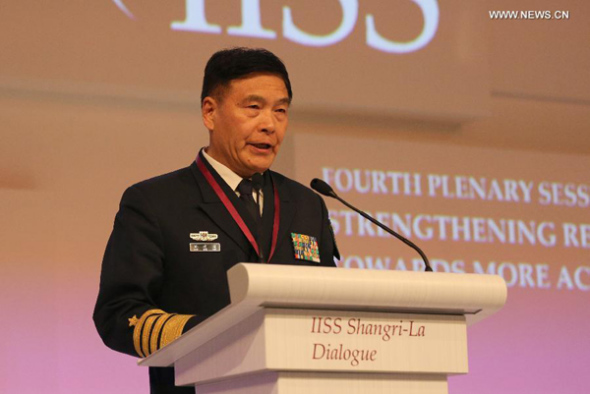Admiral Sun Jianguo, deputy chief of staff of China's People's Liberation Army (PLA) addresses the fourth plenary session of the Shangri-La Dialogue in Singapore, May 31, 2015. Sun Jianguo elaborated on China's foreign and defense policies. (Photo: Xinhua/Bao Xuelin)