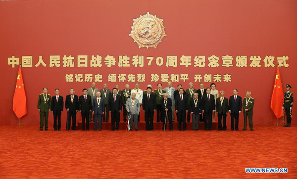 President Xi Jinping granted medals to 30 Chinese and foreign veterans and civilians who fought for China in World War II, ahead of the country's high-profile V-Day celebrations.[Special coverage]