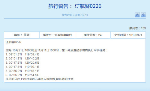 The Chinese People's Liberation Army (PLA) will perform military missions in the relevant waters of the Bohai Sea from 18:00 of October 21 to 18:00 of November 11, 2015, according to the official website of the Liaoning Maritime Safety Administration (LMSA) of the People's Republic of China (PRC).