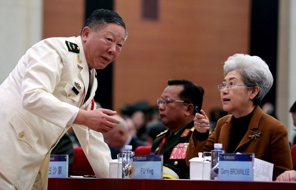 Fu Ying (right), foreign affairs chief of China's top legislature, talks with Guan Youfei, in charge of international military cooperation, on Tuesday at the Xiangshan Forum. (Photo by FENG YONGBIN/CHINA DAILY)