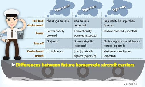 Li said the Type 002 will look different from the Liaoning, a refitted Soviet-era carrier purchased from Ukraine, and the Type 001A, which resembles the Liaoning and was launched on April 26 in Dalian Shipyard in Northeast China's Liaoning Province.