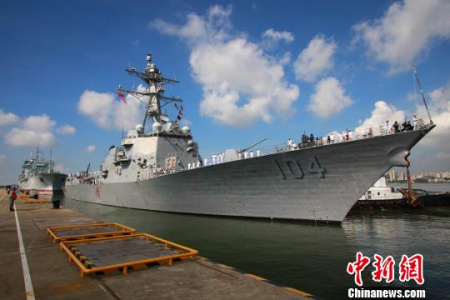 Naval officers and soldiers of the South China Sea Fleet under the Navy of the People's Liberation Army (PLA) held a welcoming ceremony at the port for the visiting U.S. destroyer.