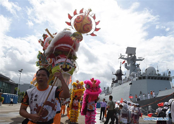Chinese frigate Yantai is welcomed upon its arrival at the People's Liberation Army Hong Kong Garrison's naval base in Stonecutters Island in Hong Kong Special Administrative Region (HKSAR), south China, July 7, 2017. A flotilla including China's first aircraft carrier Liaoning on Friday arrived in HKSAR for a visit, during which Liaoning will, for the first time, be open for the public to visit. According to the Navy's plan, sailors of the flotilla will attend local activities to celebrate the 20th anniversary of the People's Liberation Army being stationed in the HKSAR. (Xinhua/Qin Qing)