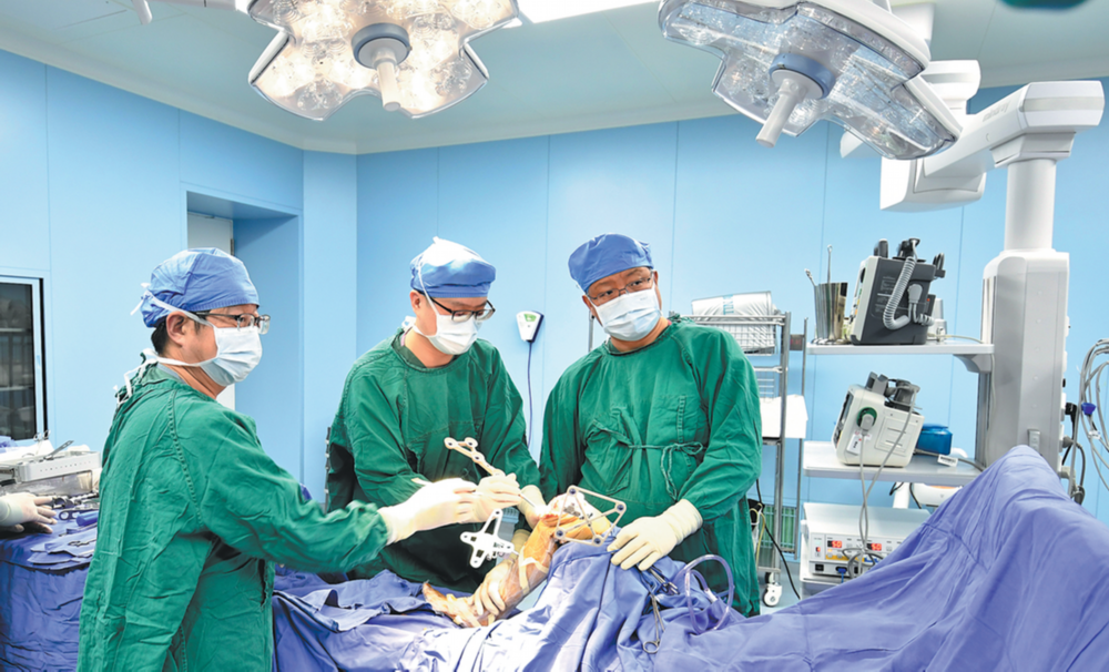 Surgeons perform orthopedic joint surgery using a TiRobot at Beijing Anzhen Hospital Affiliated with Capital Medical University on Feb 3. The advanced robotic system is designed to improve accuracy and outcomes in orthopedic procedures. (Li Xin/Xinhua)