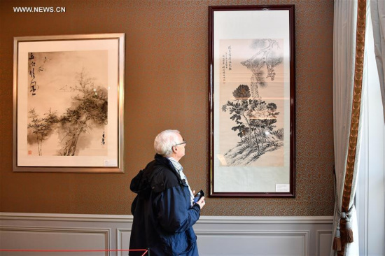 A visitor enjoys Chinese paintings in Chinese embassy in Paris, France, on Sept. 17, 2017. Chinese embassy in France opened for the first time in the annual European Heritage Days in Paris, France on Sunday. (Xinhua/Chen Yichen)