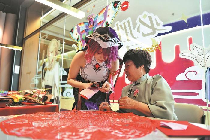 Hao Guifen (right) guides a young enthusiast in paper-cutting techniques during an activity in Tianjin in April 2023. HU LINGYUN/FOR CHINA DAILY