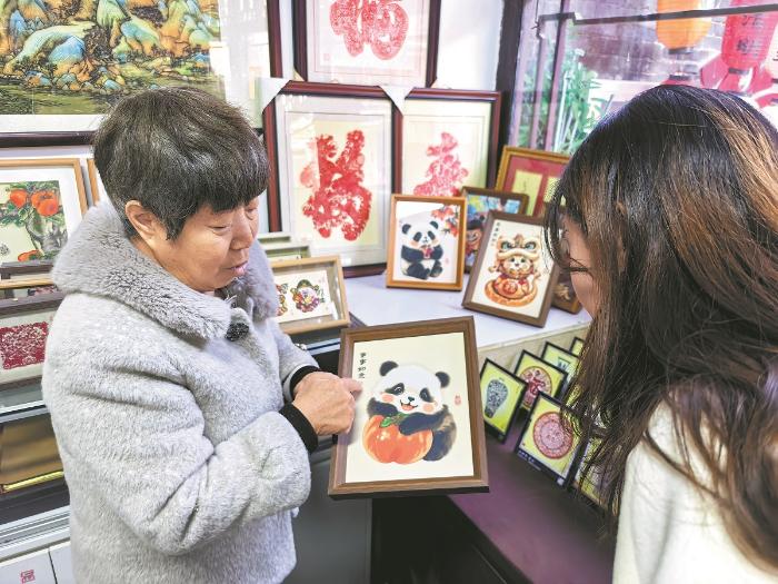 Hao introduces a multilayered paper-cutting work featuring a giant panda and a persimmon at her studio in Tianjin in February. (Photo provided to China Daily)