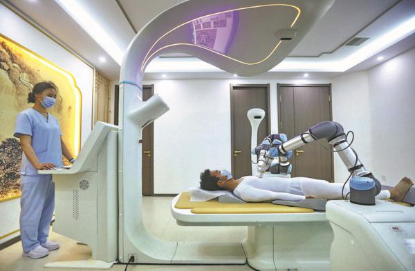 A visitor (right) experiences a massage treatment conducted by an intelligent robot at a health maintenance store in Qinhuangdao, Hebei province, on June 18. (CAO JIANXIONG/FOR CHINA DAILY)