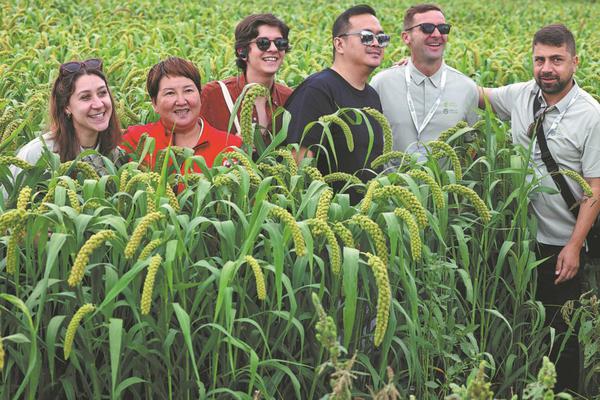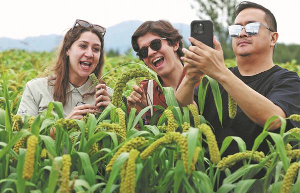 Three participants take a closer look at millet grown at the plot. ZHU XINGXIN/CHINA DAILY
