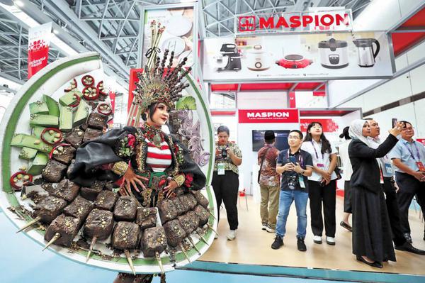 A woman wearing an outfit featuring local delicacies of Indonesia stands near the country's pavilion to attract visitors during the 22nd China-ASEAN Expo and the China-ASEAN Business and Investment Summit on Wednesday in Nanning, Guangxi Zhuang autonomous region. (ZHANG WEI/CHINA DAILY)