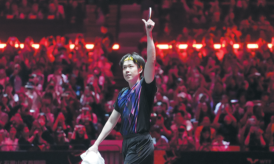 China's Wang Chuqin celebrates after defeating Felix Lebrun of France 4-0 to claim the men's singles title at the World Table Tennis China Smash in Beijing on Sunday. (LIU PING/FOR CHINA DAILY)