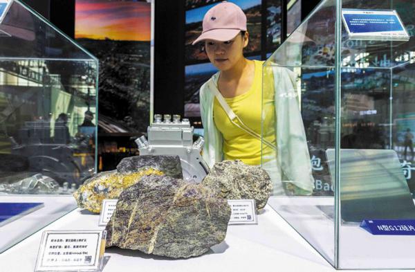 A visitor examines a rare earth iron ore exhibit at the Fifth China-Mongolia Expo in Hohhot, Inner Mongolia autonomous region, on Aug 26. Photo/CHINA DAILYChina is pioneering a green transformation of its rare earth industry through world-leading technological innovation, setting global standards for sustainable mineral extraction, company executives and experts said.