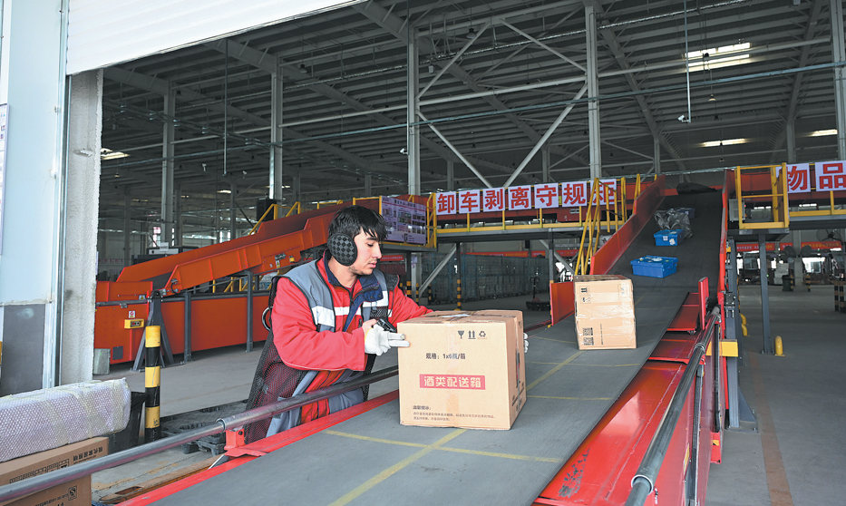 An employee uses intelligent sorting systems to transport packages at a 5G-driven smart logistics hub in the Kashgar area of the China (Xinjiang) Pilot Free Trade Zone. (CHEN ZHAO/CHINA DAILY)