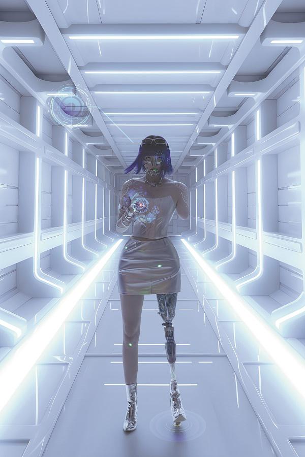 Weng Youyou, who lost her left leg and arm in a car accident in 2020, is seen in this stylized photo with her "cyberpunk" prosthetic leg on. (Photo provided to China Daily)