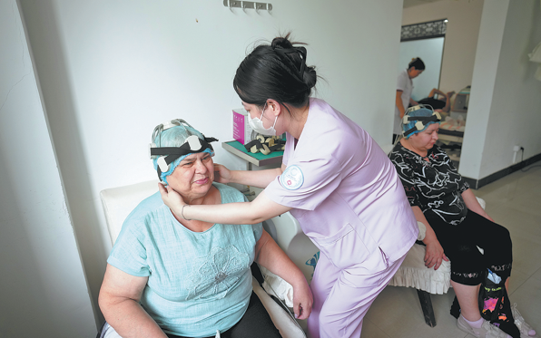 A Russian patient (left) undergoes physical therapy at Tanggangzi Hospital in Anshan, Liaoning province, on Sept 30. (PAN YULONG/XINHUA)