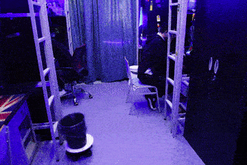 Photos show soft-blue LED blacklights lining the ceiling and dorm bunks, giving the black wallpapered room an interior of a sci-fi space capsule.