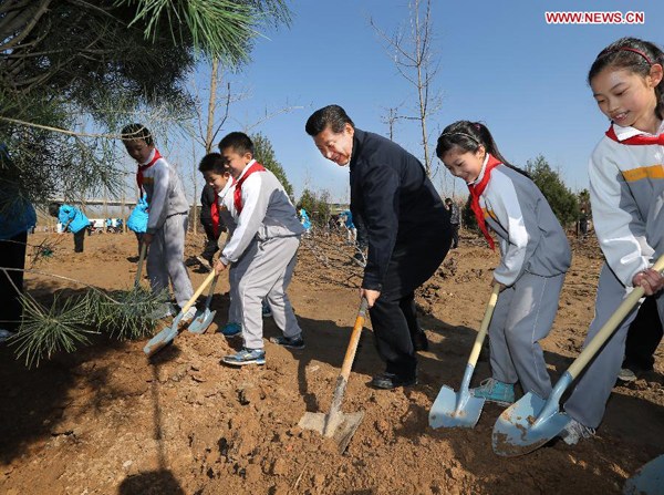 Xi planted six seedlings, including ginkgo tree and midget crabapple, during the event, which was also joined by Chinese leaders Li Keqiang, Zhang Dejiang, Yu Zhengsheng, Liu Yunshan, Wang Qishan and Zhang Gaoli.