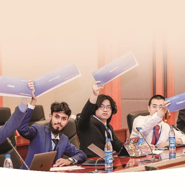 Md Yeasin Arafta (first from left) from Bangladesh participates in the 2025 China Daily Model United Nations, held in Suzhou, Jiangsu province, from Aug 3 to 6.(Photo provided to China Daily)