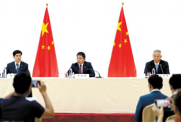 Li Chenggang (center), China's international trade representative with the Ministry of Commerce, seen at a news conference on Monday in Madrid, Spain. (Photo/CHINA DAILY)