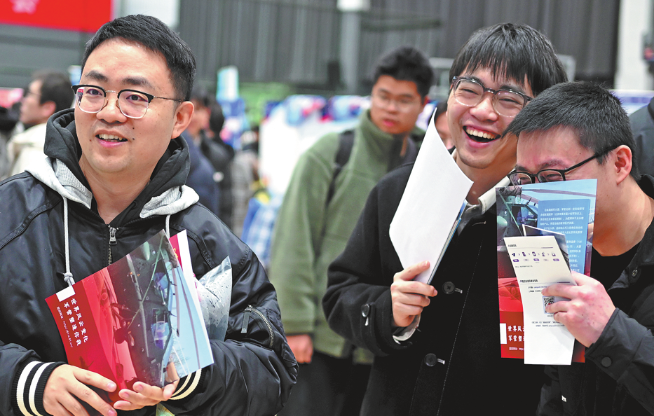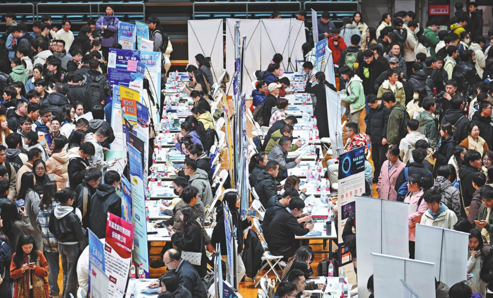 College students look for employment opportunities at a job fair on March 14 at Nanjing University of Aeronautics and Astronautics in Nanjing, Jiangsu province. More than 500 companies from across the country in fields such as artificial intelligence, low-altitude economy and new energy offered positions. YANG BO/CHINA NEWS SERVICE