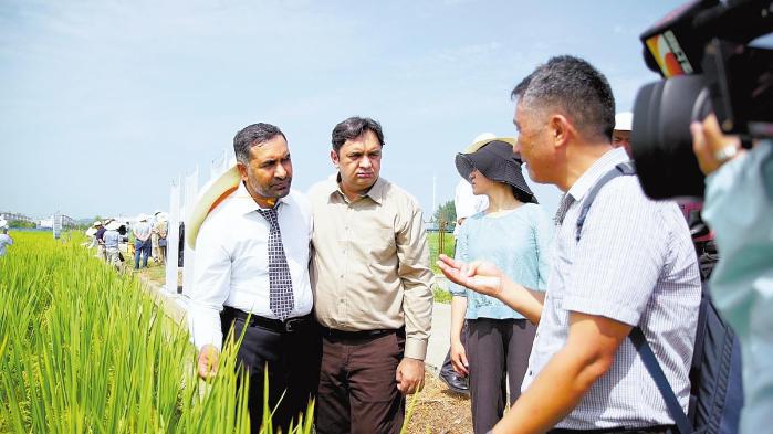 Muhammad Ashfaq (left) visits an experimental paddy field in Ezhou, Hubei province. CHINA DAILY