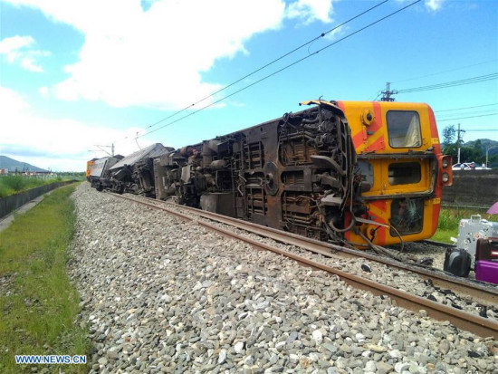 Photo taken on June 22, 2016 shows the derailed train in Hualien, southeast China's Taiwan. A train from Zuoying Station of Kaohsiung derailed at 2:49 p.m. Wednesday in Hualien, causing two persons injured. (Xinhua)