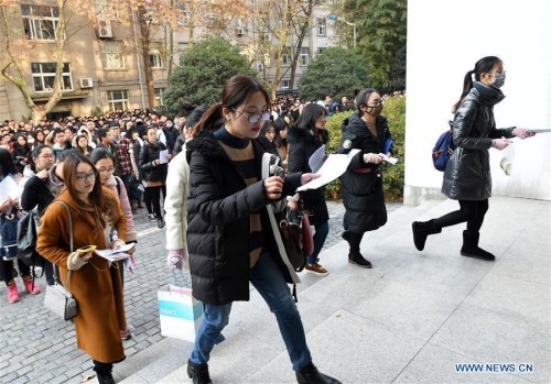 Examinees walk into Nanjing Forestry University to take the National Civil Servant Exam in Nanjing, east China's Jiangsu Province, Dec. 10, 2017. More than 1.1 million people took the National Public Servant Exam in China Sunday, a leap from last year's 984,000, marking the second time the number has hit the one million mark. (Xinhua/Sun Can)