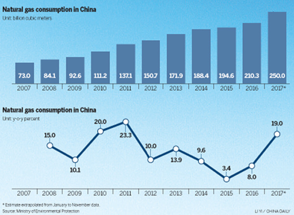 Natural gas use is expected to grow to 10 percent of China's total energy mix, up from around 7 percent now. Combined with an even stronger emphasis on anti-pollution enforcement, it will be a key component of a cleaner mix of energy use and upgraded industry.