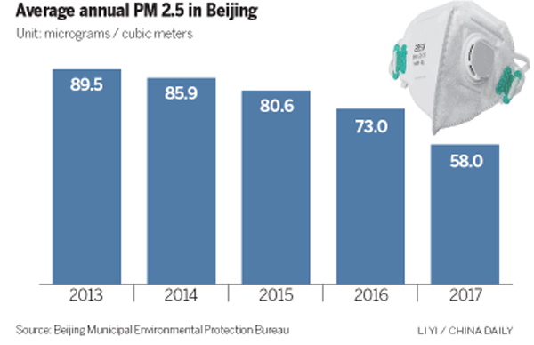 In 2013, Premier Li Keqiang announced goals to reduce pollution throughout the country. This was a fundamental change of direction from the previous emphasis solely on rapid GDP growth. Since then, policies to shift toward cleaner industry and energy brought down the average concentration of PM2.5 by almost 40 percent from 2013 in the Jing-Jin-Ji region. In Beijing, the average concentration of PM2.5 went down from 89.5 micrograms per cubic meter in 2013 to 58 mcg per cu m for the entire year of 2017-below the target of 60 set out when the campaign was launched and 36 percent below the 2013 level of 90. Throughout China, 338 cities saw an average reduction of 6.5 percent from 2016 levels.