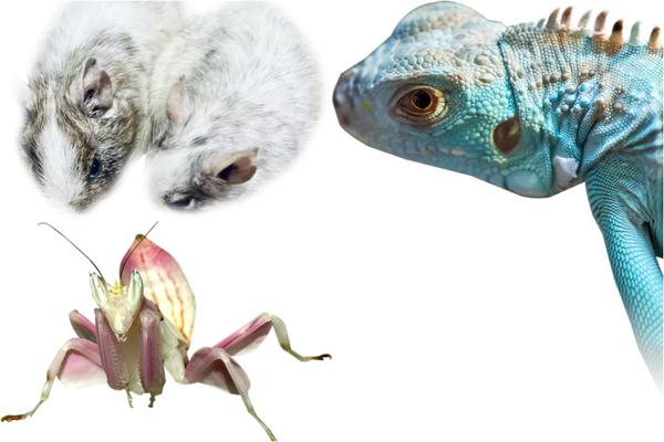 Insects such as an orchid mantis (below left), rodents such as degus (left) and lizards (a blue iguana, at right) are among popular pet choices.(YANG/FOR CHINA DAILY)