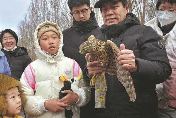 An ornithologist demonstrates raptor rescue techniques at an event hosted by the Shenyang Raptor Rescue Center in Shenyang, Liaoning province, on Sunday. (WANG QIBO/FOR CHINA DAILY)