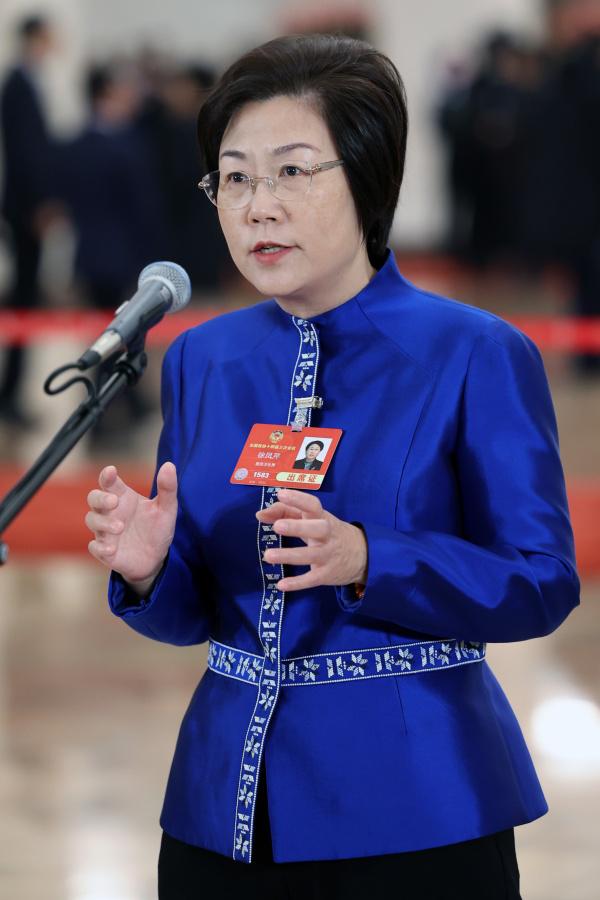 Xu Fengqin, a member of the 14th National Committee of the Chinese People's Political Consultative Conference, attends a group interview ahead of the second plenary meeting of the third session of the 14th CPPCC National Committee at the Great Hall of the People in Beijing, March 7, 2025. (Photo by Wang Jing/chinadaily.com.cn)