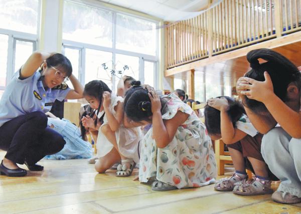 Children at Luancheng No 2 Kindergarten in Shijiazhuang, Hebei province, take part in an earthquake emergency drill under the guidance of rescue professionals on June 26. (LI MINGFA/FOR CHINA DAILY)