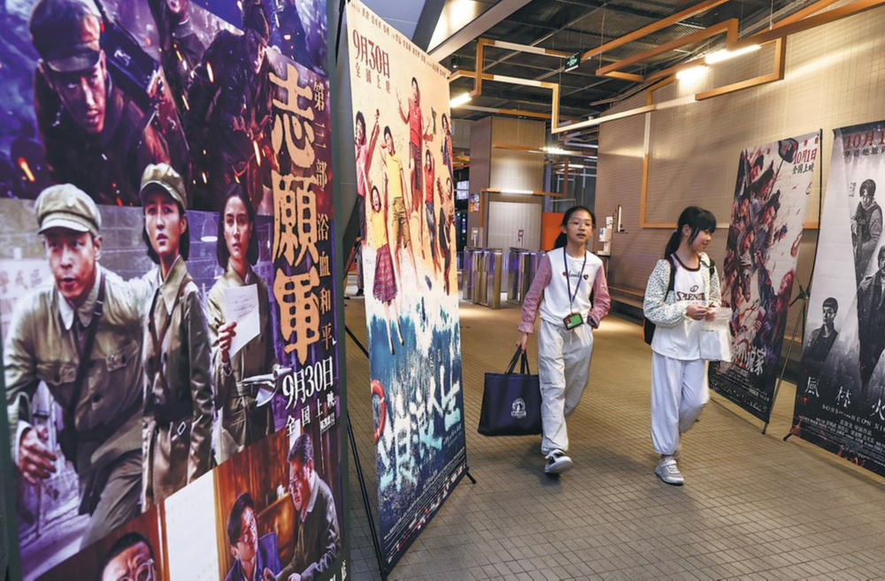 Moviegoers walk past promotional posters on Wednesday for film releases during the National Day holiday at a cinema in Wuhan, Hubei province. (ZHAO JUN/FOR CHINA DAILY)